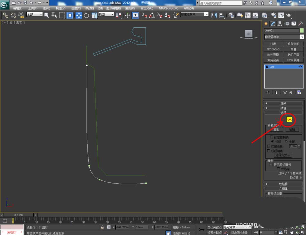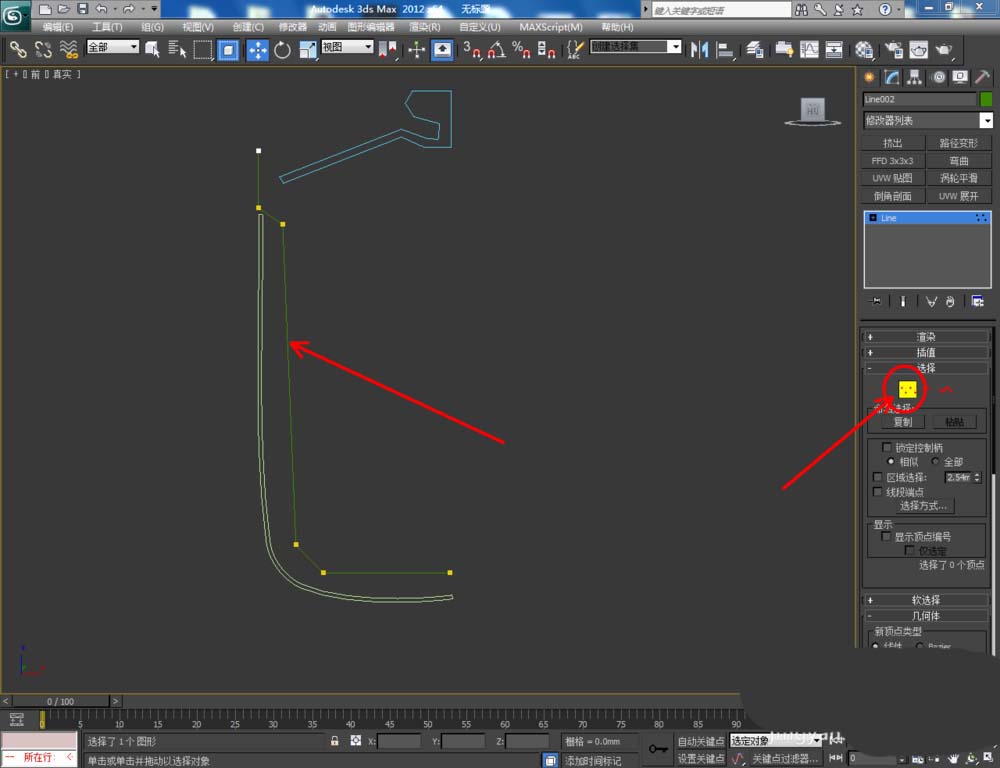 3、選中圖案1,點擊右邊工作區中的【頂點】圖標,選中圖示圖案上的點后進行圓化處理和位置調整。點擊【樣條線】圖標,選中所有樣條線后,對其進行輪廓處理(如圖所示);