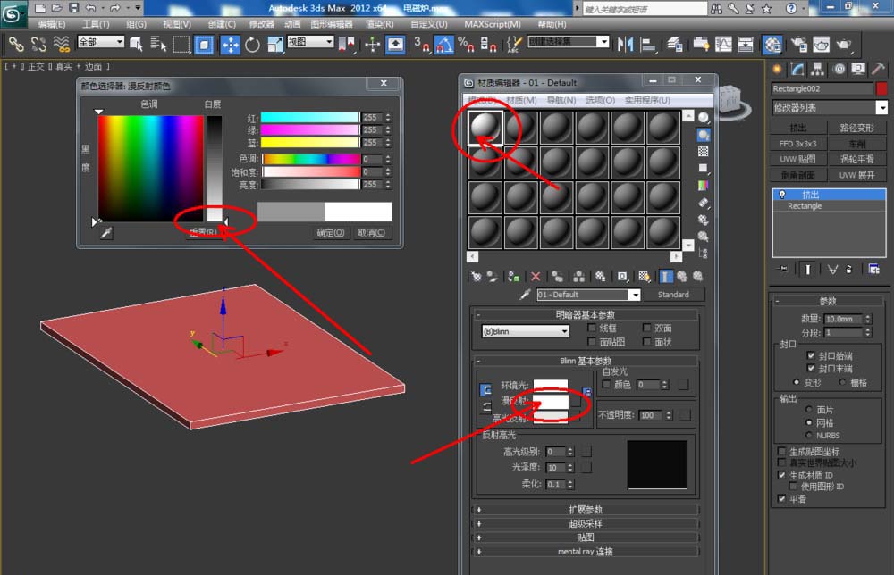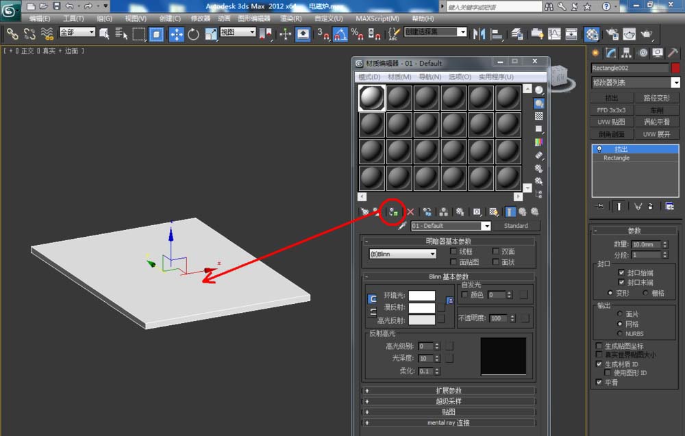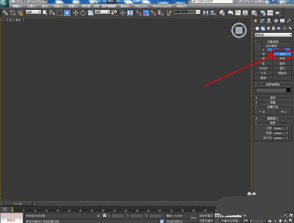 1、打開3Dmax2012軟件,點擊【創(chuàng)建】-【圖形】-【矩形】,在作圖區(qū)域繪制一個矩形圖案并按圖示設(shè)置好矩形圖案的各個參數(shù)。選中圖案,點擊【修改】-【擠出】擠出數(shù)量設(shè)置為:10mm;