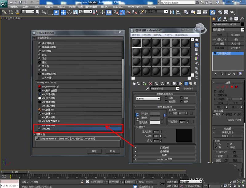 3、點擊【材質(zhì)編輯器】,彈出材質(zhì)編輯器設置框,點擊【standard】-【VAryMlt】設置一個Vary材質(zhì)球,按圖示設置好【反射】與【折射】中的各個參數(shù),制作出一個祖母綠寶石材質(zhì)球。完成后將材質(zhì)球附加給模型(如圖所示);