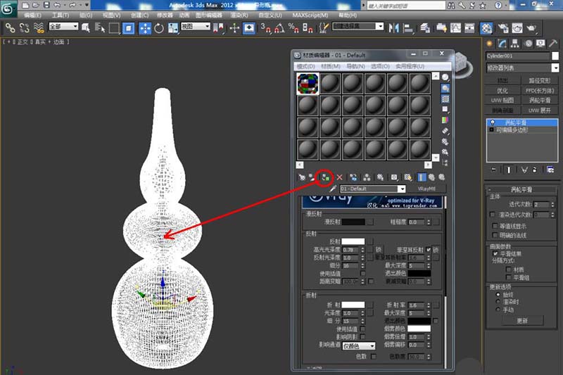 5、點擊【材質編輯器】彈出材質編輯器設置欄,按圖示設置一個玻璃材質球并將其附加給瓶子模型。完成后,點擊【渲染】將制作好的瓶子模型渲染出圖即可。