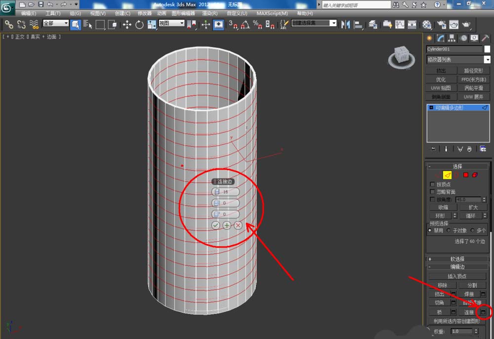 3、點擊右邊工作區中的【邊】圖標,選中圖示模型上的邊后,點擊【連接】右邊的小方框并設置好連接的各個參數。點擊【頂點】圖標,選中圖示模型上的點,通過縮放命令,將選點縮放至同一水平線上,依次完成連接線上點的縮放操作(如圖所示);