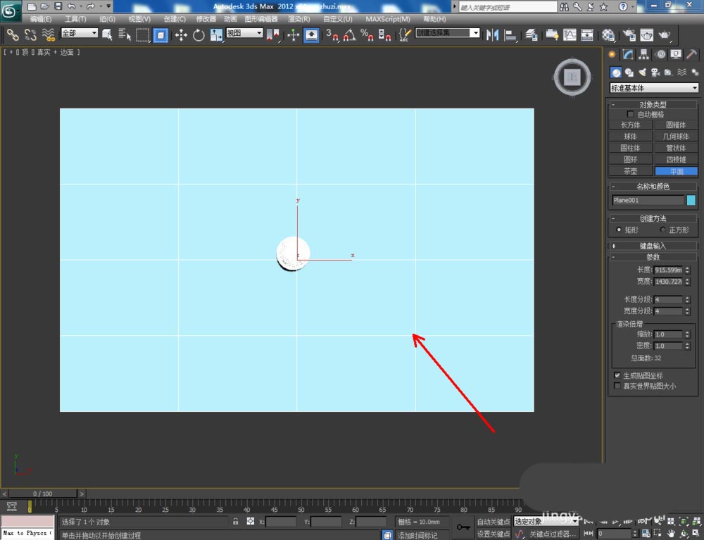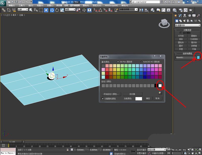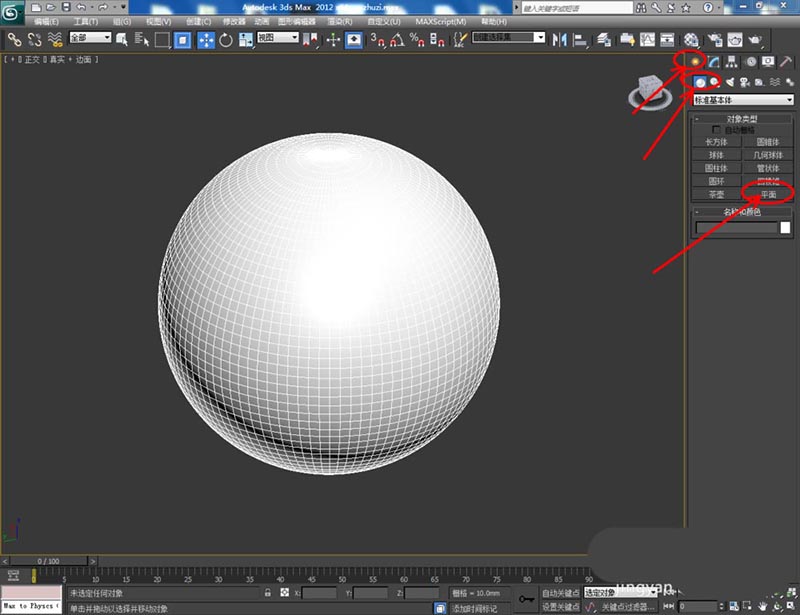 2、點擊【創(chuàng)建】-【幾何體】-【平面】,按圖示在球體模型的下方繪制一個平面模型。選中平面模型,點擊【對象顏色】將模型的對象顏色設置為:白色;