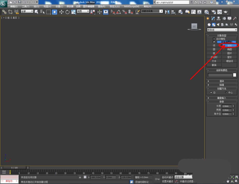 1、打開3Dmax2012軟件,點擊【創(chuàng)建】-【圖形】-【矩形】,在作圖區(qū)域繪制一個矩形參考圖案并按圖示設置好矩形圖案的各個參數(如圖所示);