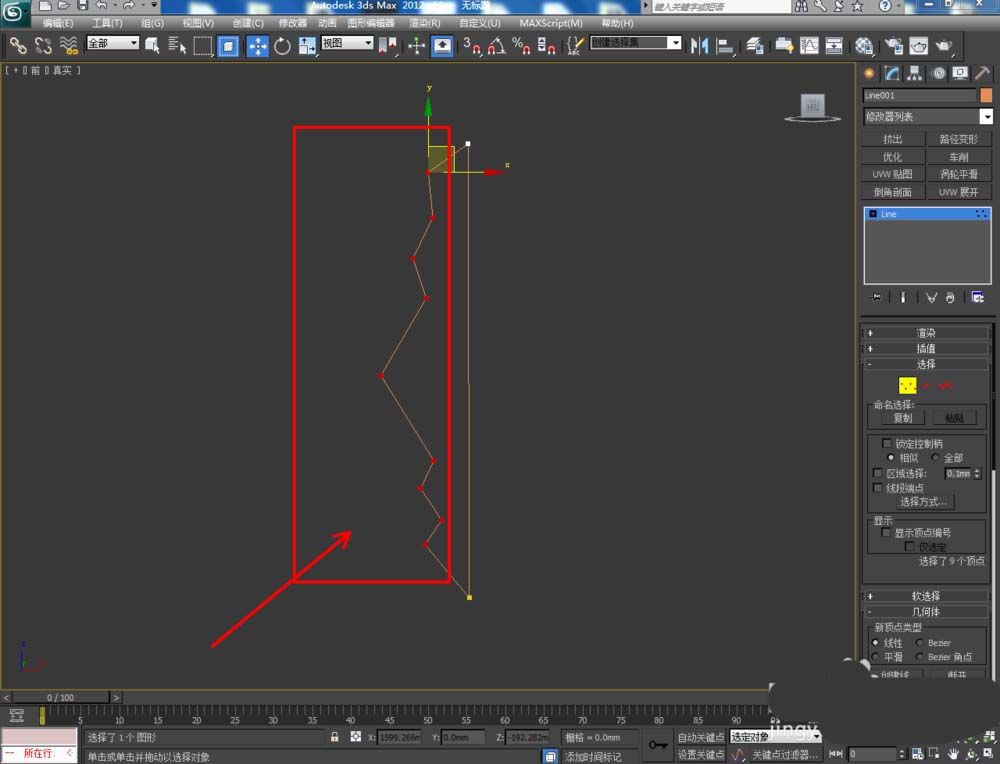 2、切換到前視圖,點擊【矩形】繪制出一個參考矩形線框并按圖示設置好線框的各個參數。點擊【線】按圖示以矩形線框為參考,繪制出一個多邊圖案。完成后,將矩形參考線框刪除(如圖所示);