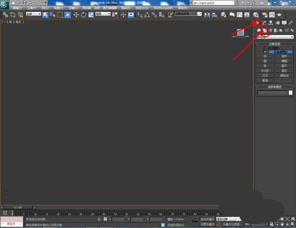 1、打開3Dmax2012軟件,點擊【創建】-【圖形】-【矩形】,按圖示在作圖區域繪制一個矩形圖案作為腰線路徑并設置好矩形的各個參數。選中矩形圖案,點擊【對象顏色】將圖案的對象顏色設置為:白色;