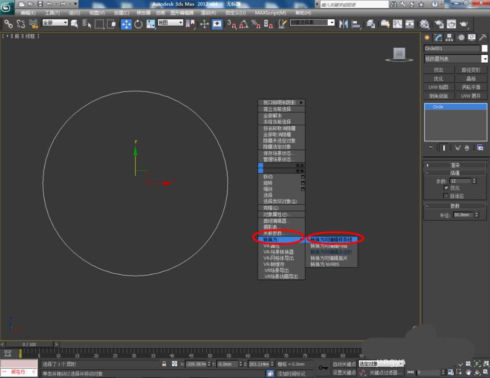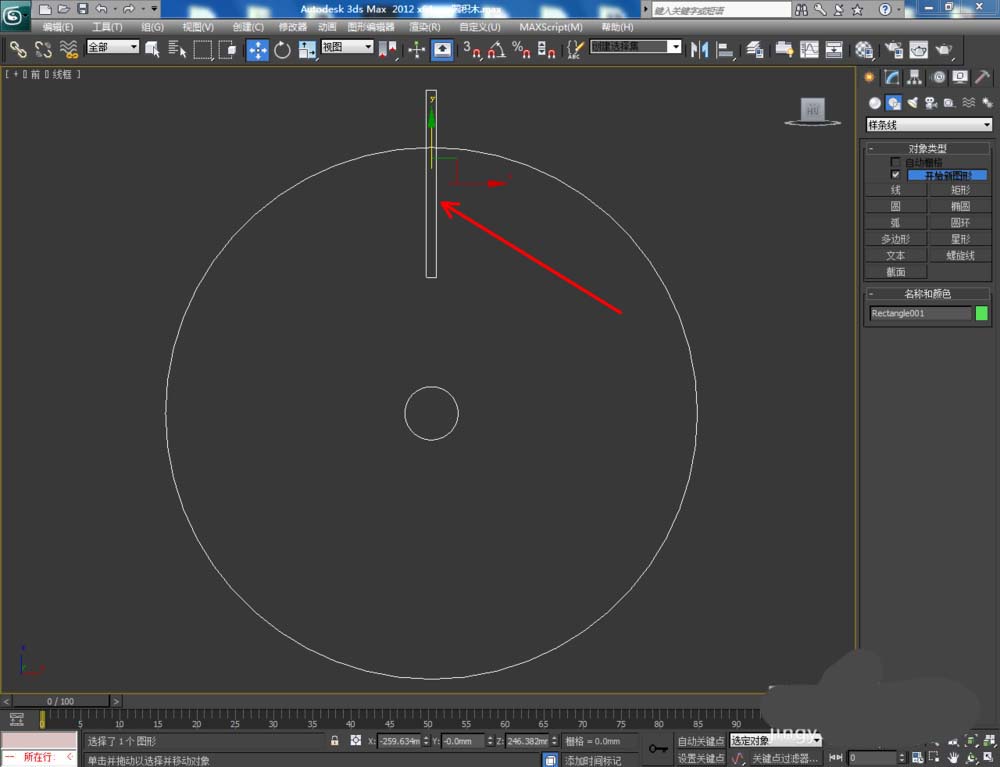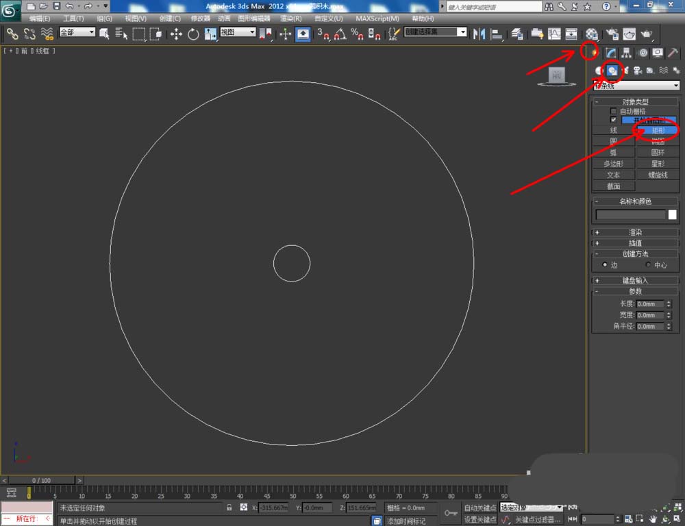 1、打開3Dmax2012軟件,點(diǎn)擊【創(chuàng)建】-【圖形】-【圓形】,在作圖區(qū)域繪制一個(gè)圓形圖案并設(shè)置好圓形圖案的各個(gè)參數(shù)(如圖所示);