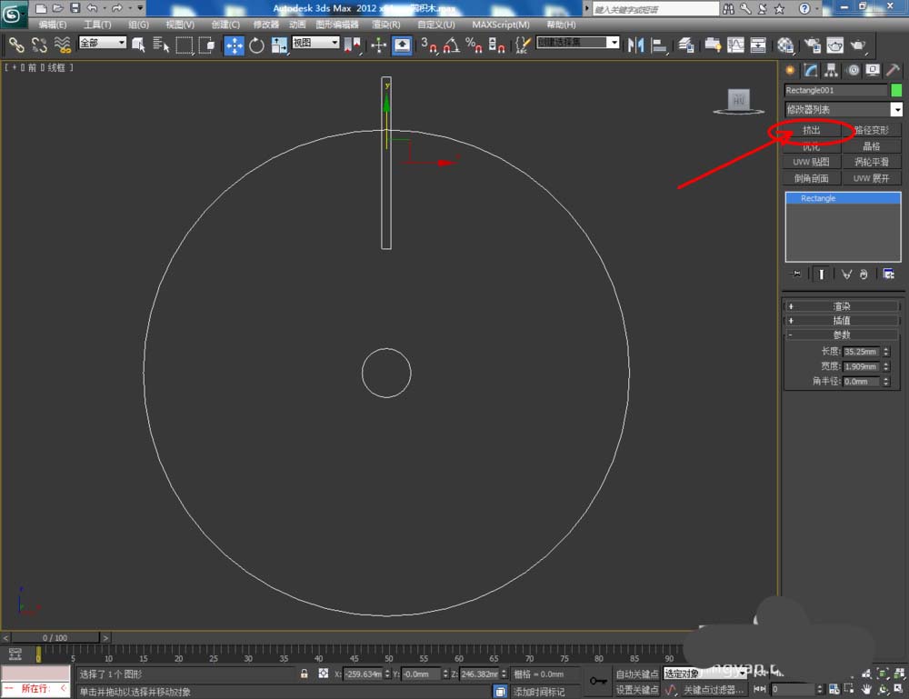 3、點(diǎn)擊【創(chuàng)建】-【圖形】-【矩形】,按圖示繪制一個(gè)矩形圖案后,點(diǎn)擊【修改】-【擠出】并設(shè)置好擠出的各個(gè)參數(shù),擠出一個(gè)長(zhǎng)方體模型(如圖所示);
