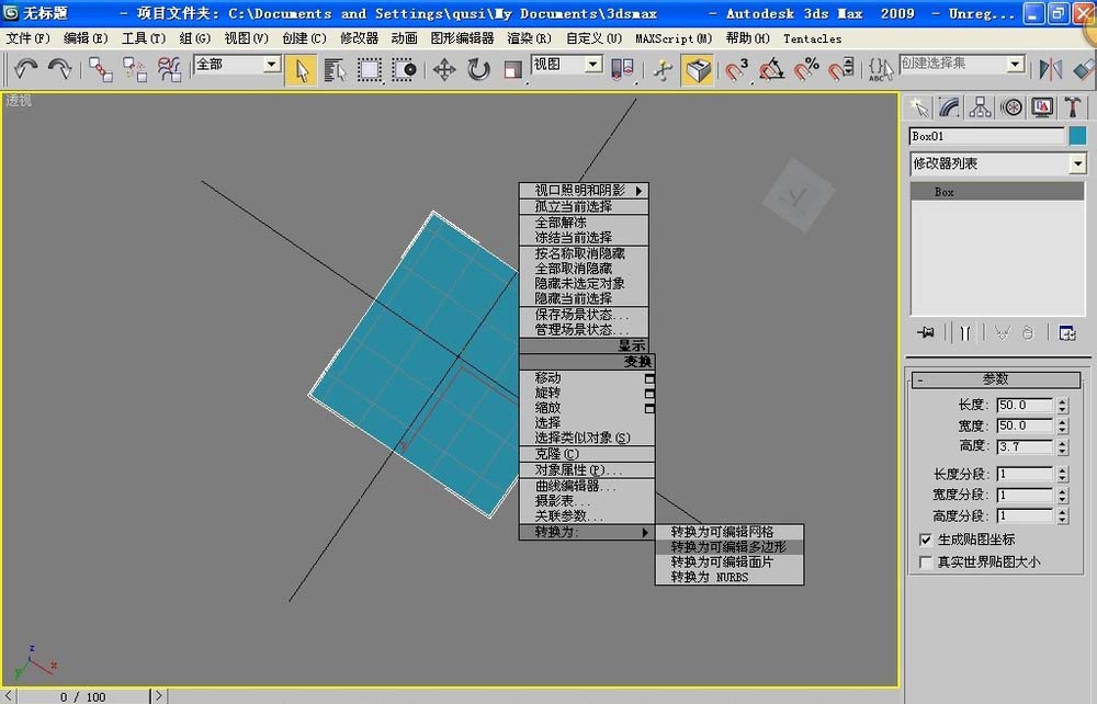 1、我們創建一個長方體,F4邊面顯示。參數:長度、寬度改為:50 高度改為:3.7。其他的參數保持默認。