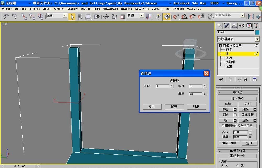 8、選擇頂部兩根相對柱子上的相對的兩根線(記住,不要選擇底部的線哦!),點擊連接。彈出窗口設置:分段:1 滑塊:22 收縮:0。一定要細細檢查你選擇的線。