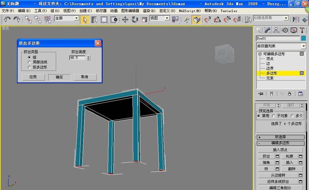 5、我們選擇連接好的四條線,再次連接。我們弄好框架后,進入多邊形子級別,選中連接后出現的四個小正方形,點擊擠出旁邊的小圖標。設置參數為:類型默認為:組 擠出高度為46.5 。