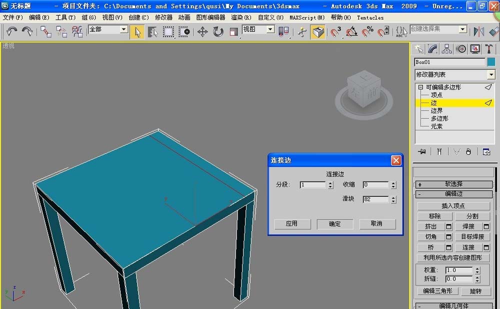 6、來到頂部的面,選擇兩條邊,點擊連接。彈出窗口設置參數:分段:1 收縮:0。滑塊:82