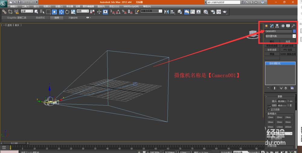 5、選中攝像機(jī),并在【修改】面板下,查看其名稱為【Camera001】