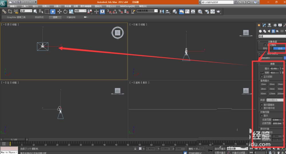 7、創(chuàng)建【自由】攝像機(jī)如下圖所示,【創(chuàng)建】->【攝像機(jī)】->【自由】->【參數(shù)】->鼠標(biāo)點(diǎn)擊即可