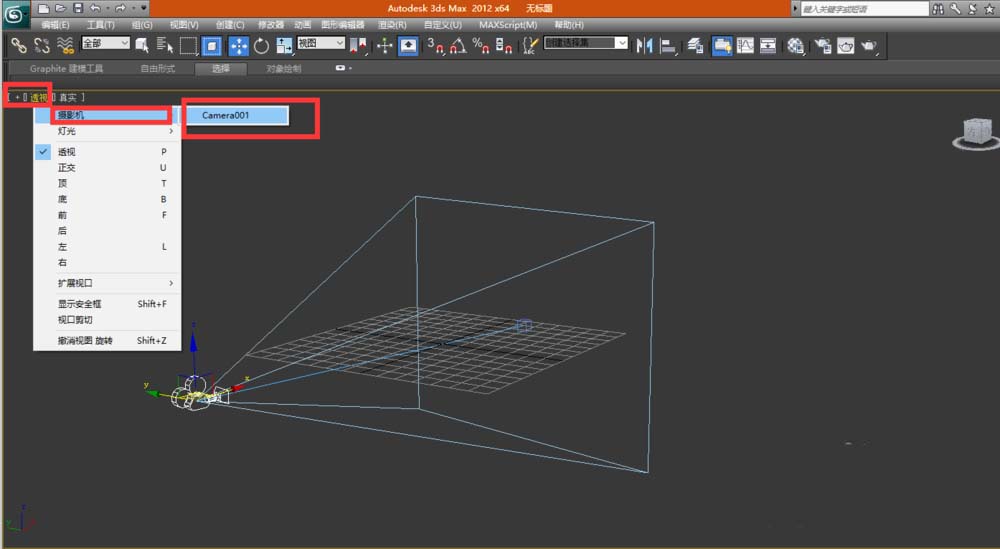 6、在透視窗口下,點(diǎn)擊左上角的【透視】->【攝像機(jī)】->【Camera001】,如下圖所示,顯示的結(jié)果如下圖所示