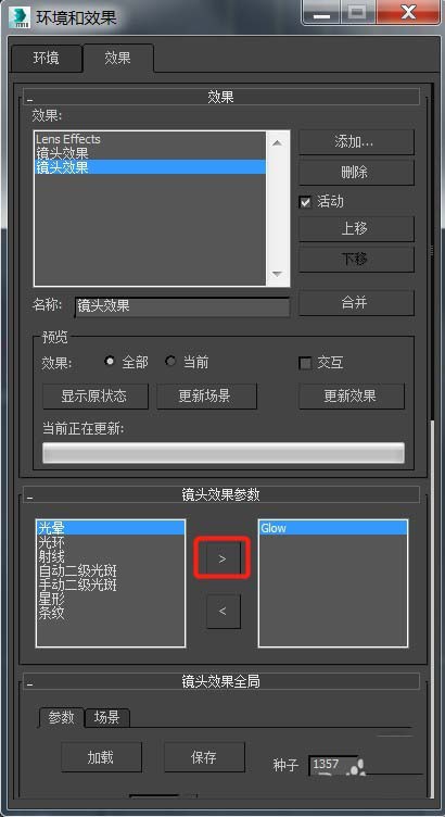 3、設置的對話框如下圖所示,效果為“鏡頭效果”,下方的”鏡頭效果參數”選擇"光暈",利用箭頭添加到右側,就會出現“Glow”,選擇它之后下方對其各項光暈參數進行設置;