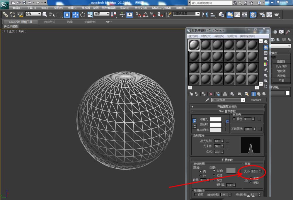 3、點擊【材質編輯器】,將白色材質球中的【線框】和【雙面】勾選,點擊下方的【擴展參數】,設置好線框的參數大小后,點擊渲染,制作出線框球體模型(如圖所示);