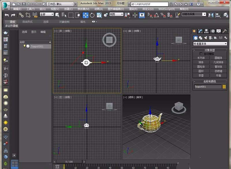2、可以看到在試圖中產生了頂視圖、左視圖、前視圖及透視圖。頂視圖被選中,視圖的邊框顯示為黃色,并且模型位于視圖的中心,選擇模型,如圖所示