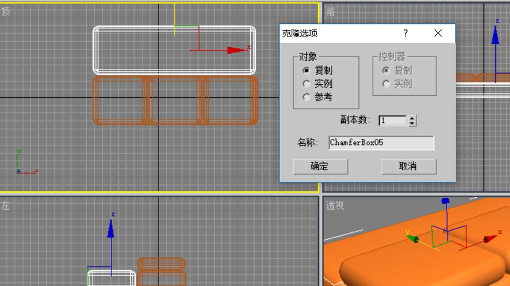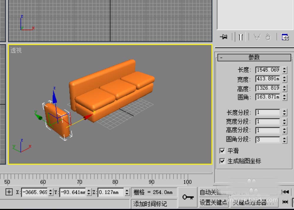 9、選擇剛創建的長方體,向右移動復制一份,并與大長方體對齊。至此,沙發模型創建完成。