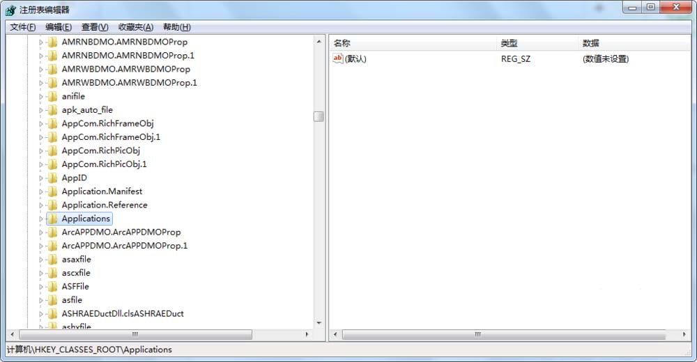 2、在注冊表里找到 HKEY_CLASSES_ROOT 選項卡下面的 Applications;