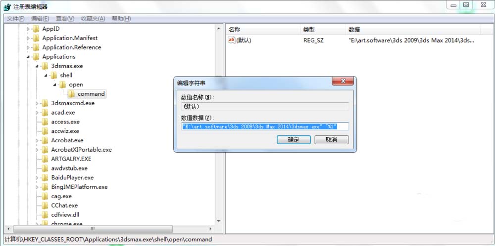 4)回到注冊表中,雙擊“默認名稱”,把數值數據替換為 "E:/art.software/3ds 2014/3ds Max 2014/3dsmax.exe" "%1" (斜體文字是你的MAX軟件安裝路徑)確定保存。
