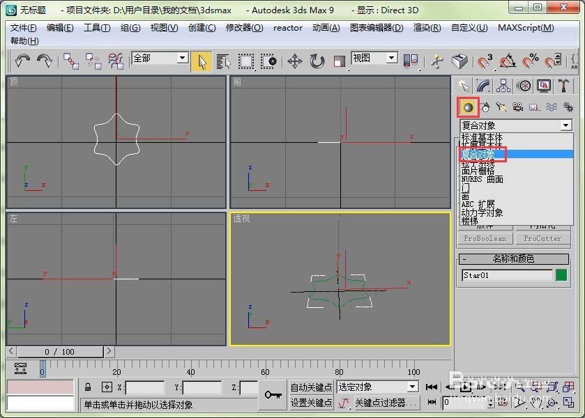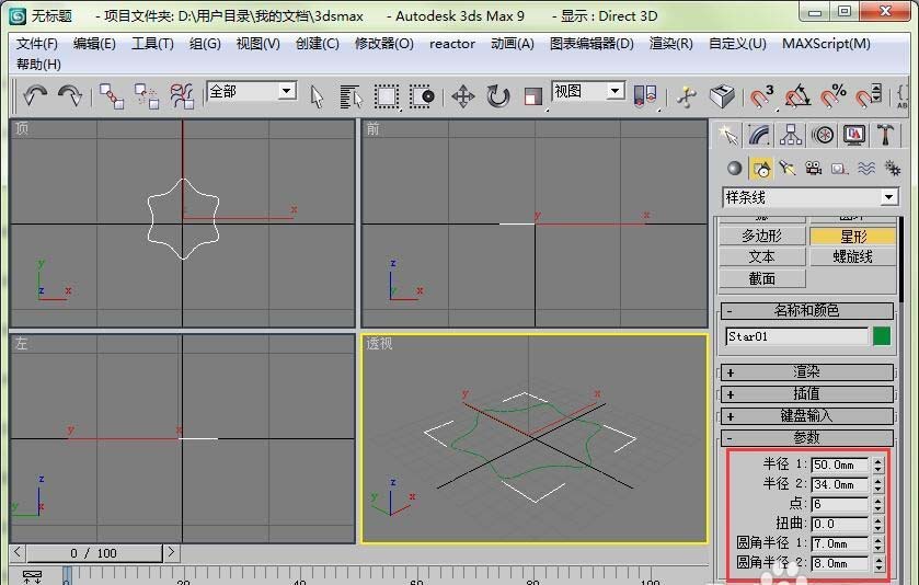 1、在創建面板中單擊圖形按鈕,然后類型選擇樣條線,選擇星形。