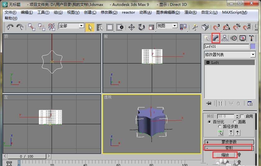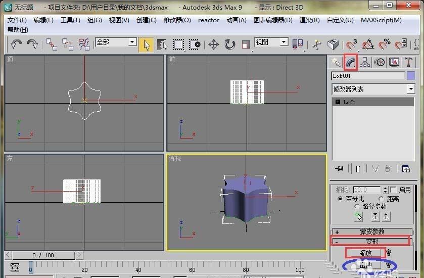 7、進入修改面板,在變形的卷展欄中有縮放按鈕。