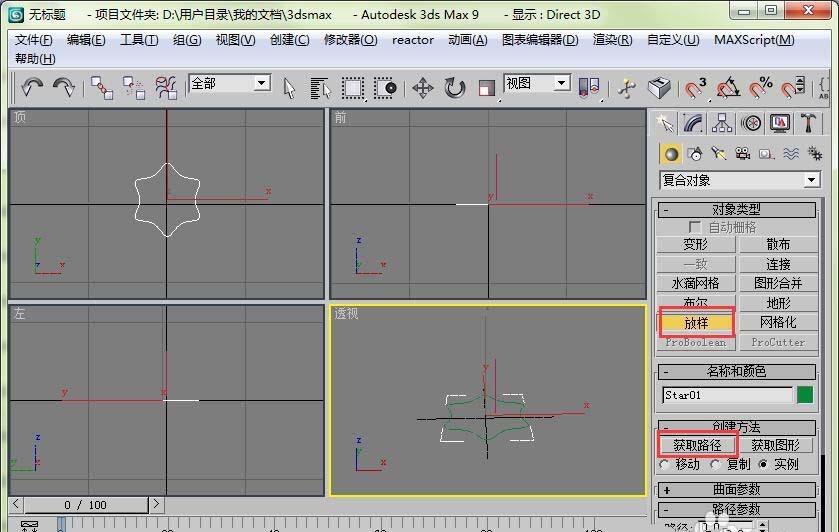 5、單擊復合對象,點擊下方的“放樣”按鈕,在卷展欄中點擊獲取路徑。