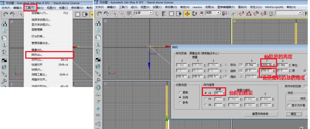 本內容主要介紹如何利用陣列工具和3dsmax基本工具快速、準確的制作一個旋轉樓梯的模型。