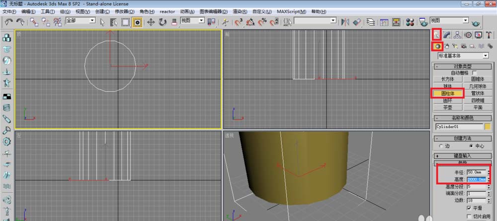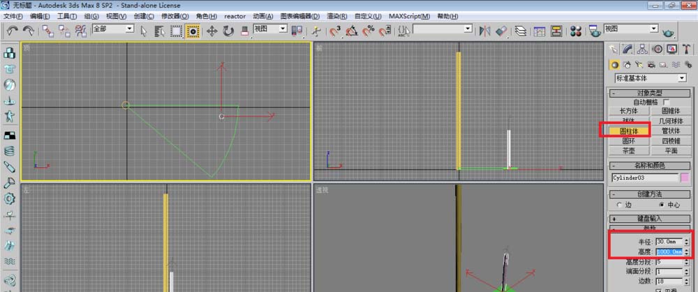 2、單擊創建面板下的圓柱體,在頂視圖建立一個圓柱體作為中心支柱。