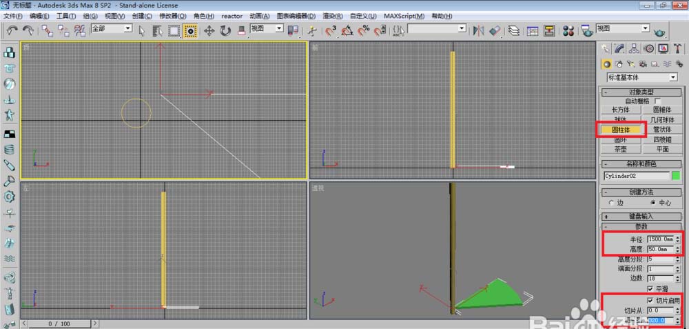 3、單擊圓柱體,在頂視圖建立一個扇形作為樓梯臺階。