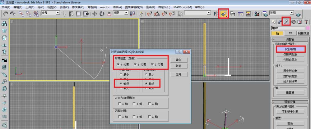 6、選中剛剛組合的對象,進入層次面板,點擊僅影響軸,再單擊對齊工具,單擊中心支柱,讓軸和中心支柱的軸對齊,對齊后退出層次面板。