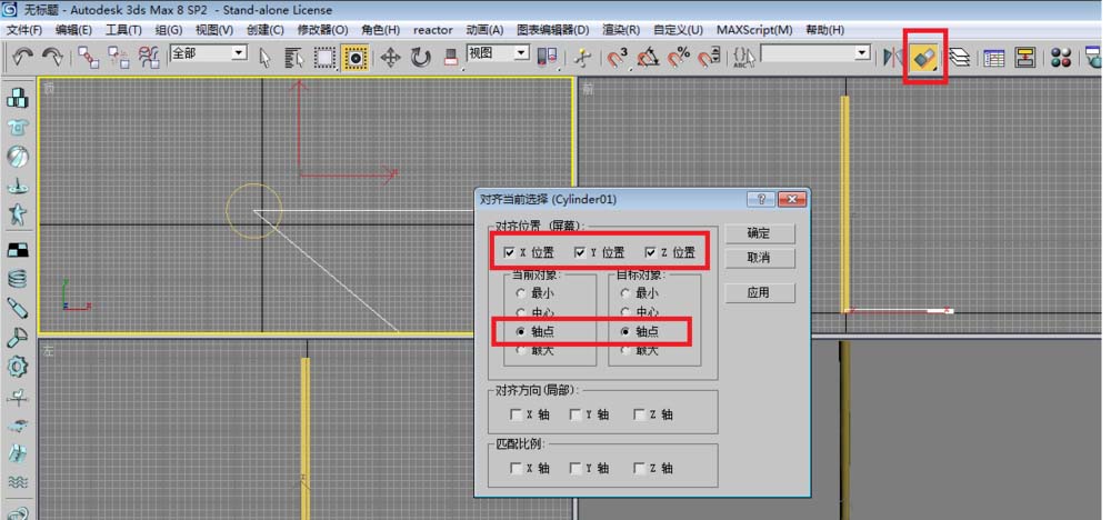4、選中剛剛建立的扇形,點對齊工具,在中心支柱對象上單擊,讓扇形的軸點同中心支柱軸點進行對齊。