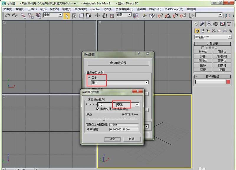 1、打開3dmax9,首先要進行單位設置,將顯示單位和系統(tǒng)單位都設置成毫米。