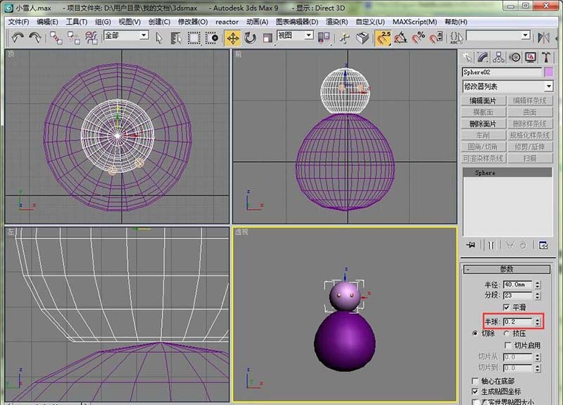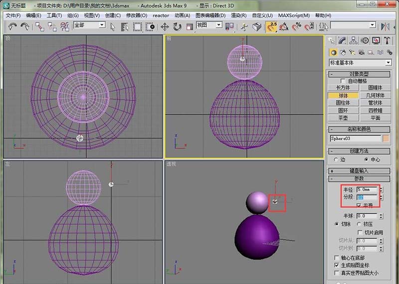 5、然后在做一個球體,這個部分當做玩具的頭部。大小可以自己設置。大或者小看自己喜好了。主要是要將這個球體放在剛剛身體上面,開捕捉,結合幾個視圖移動。