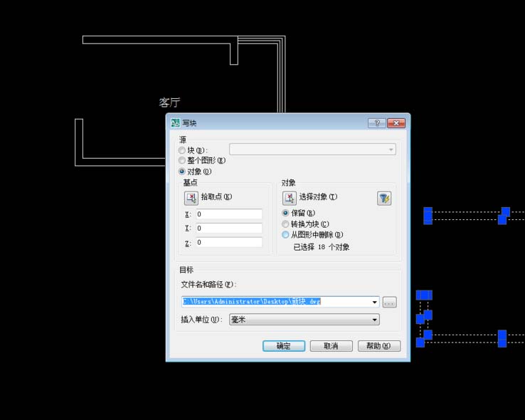 1、作效果圖之前我們一般都有相應的戶型圖。我們就拿一個簡單的案例來講一下,ps:這個是我模擬的客廳圖!!!就這樣吧!首先在CAD中把你要建模的房間復制一份出來,刪除多余的東西,只留下墻線;其次選中這些墻線,按W鍵,在空格確定,將所選墻線寫塊(一般我就是放在桌面,文件不大,一會到3d里面要用的哦!)