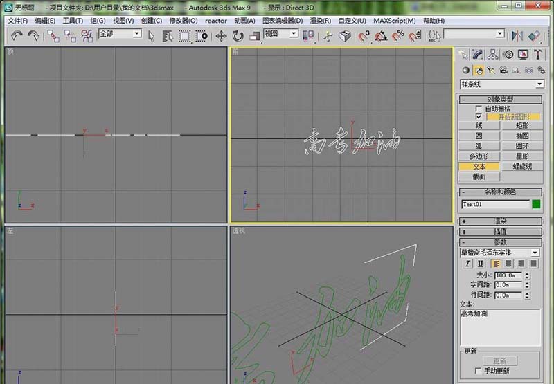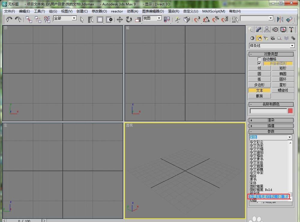 1、首先打開3dmax ,在樣條線下可以創(chuàng)建文本,然后下面有可以選擇字體類型了
