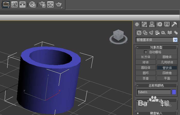 1、打開3d max軟件(這里用的3d max2010版的軟件)??煽吹剿膫€視圖窗口,在窗口的右邊,鼠標左鍵單擊面板的【幾何體】按鈕,選擇【標準基本體】,在透視圖上,拖動繪制管狀體出來,如下圖所示。