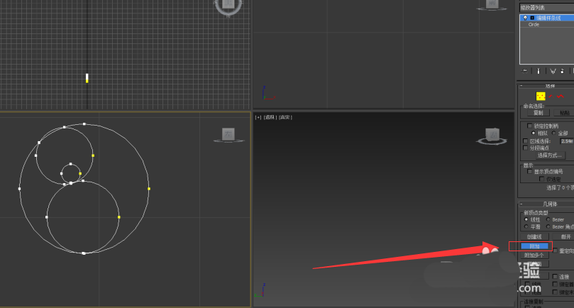 3、選中一個圓,在右側修改器列表下選擇“編輯樣條線”修改器,選擇“附加”工具,將其他幾個圓附加到一起;