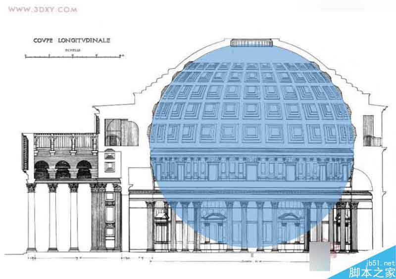 首先我們通過剖面圖可以看出,整個穹頂部分其實就是一個被切開的球體.那么從球體開始創建就不容置疑了.
