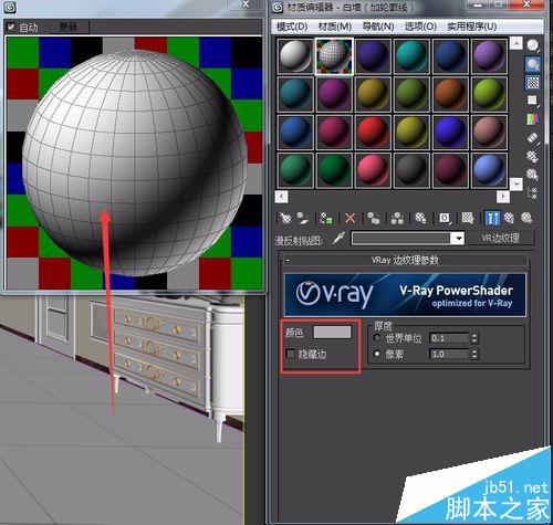6、下面,看一下“ 白墻(加輪廓線)”材質(zhì)如何調(diào)試,將VR材質(zhì)的漫反射改為VR邊紋理,顏色改為灰色,如下圖