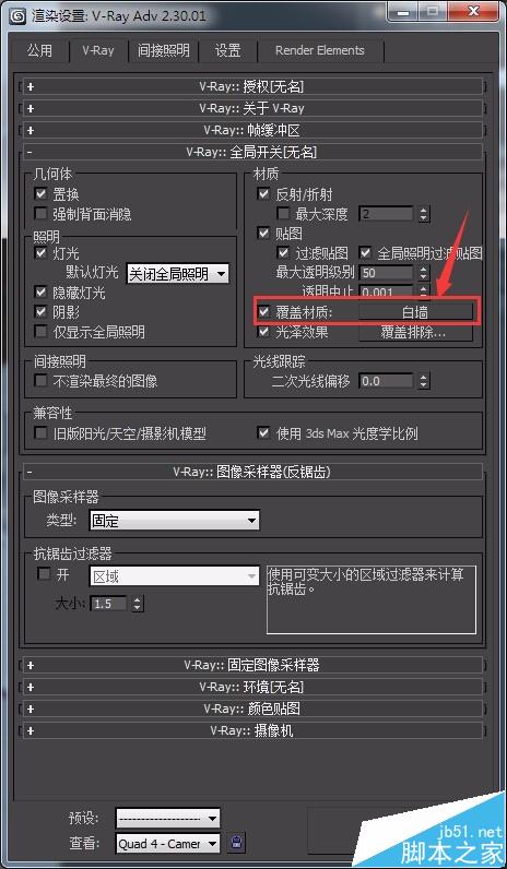 2、然后,打開(kāi)渲染設(shè)置——V-Ray:全局開(kāi)關(guān)下,勾選覆蓋材質(zhì),添加白墻材質(zhì),如下圖