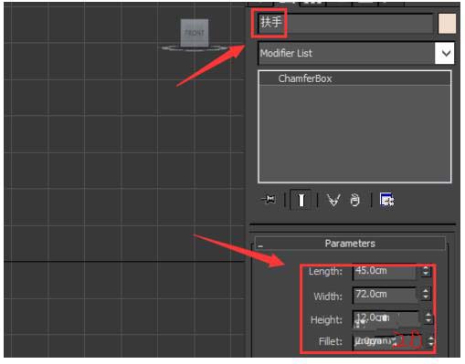 7、選擇創建出來的這個物體,在modify里修改名字為扶手,參數修改如圖所示: