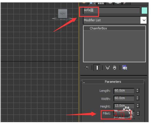 3、點擊chamferbox命令在top視圖里常見一個chamferbox物體作為sofa的底座,如圖所示: