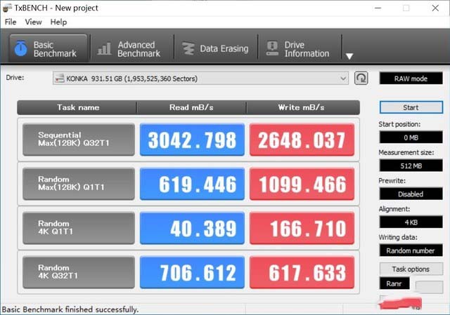 在Txbench測試中,連續(xù)最大讀取性能在3042MB/S,最大寫入則保持在2648MB/S。