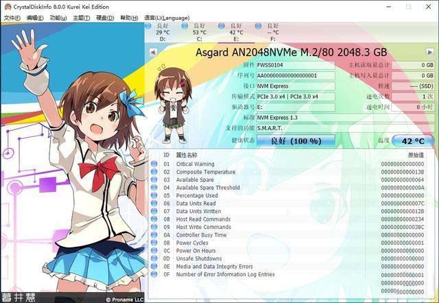 先格式化,實(shí)際可用容量是1907GB,通過CrystalDiskInfo能看到硬盤信息,寫入量為0,通電時(shí)間也為0,確定是船新版本,傳輸模式為PCIe 3.0×4,NVMe 1.3標(biāo)準(zhǔn)。在室溫24℃的環(huán)境下硬盤溫度為42℃,看來以后還是要為它要加個(gè)散熱片啊。