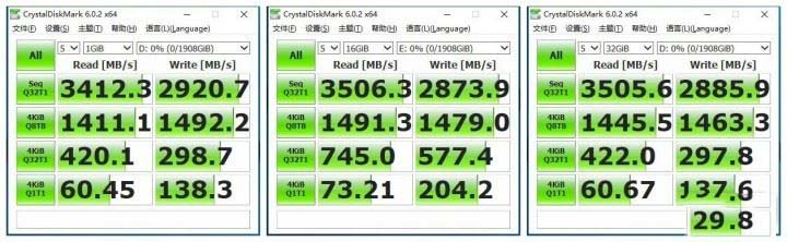 由于阿斯加特AN2固態(tài)硬盤帶外置緩存,為此阿魯分別用1GB、16GB、32GB文件大小進(jìn)行測(cè)試,而1GB用于測(cè)試固態(tài)硬盤在有緩存加速下的性能,也就是最優(yōu)狀態(tài)下的性能表現(xiàn)。而16GB和32B容量則是通過連續(xù)寫入大量數(shù)據(jù)耗盡SLC模擬緩存,測(cè)試沒有緩存加持下TLC顆粒的真實(shí)讀寫性能。從上圖能看到,性能表現(xiàn)還是令人滿意。