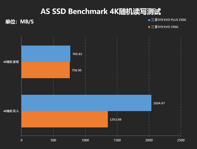 從上面的測(cè)試成績(jī)我們可以看到,在本項(xiàng)目的測(cè)試中,兩款固態(tài)硬盤的順序隨機(jī)讀取成績(jī)接近,沒(méi)有什么太大的差別,均超過(guò)了3500MB/S,而在順序隨機(jī)寫入方面,三星970 EVO PLUS 250G固態(tài)硬盤提升了超過(guò)69%,性能提升非常明顯。