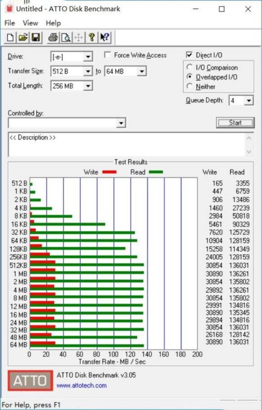 ATTO的順序讀寫速度普遍保持在135MB/S,30MB/S左右。