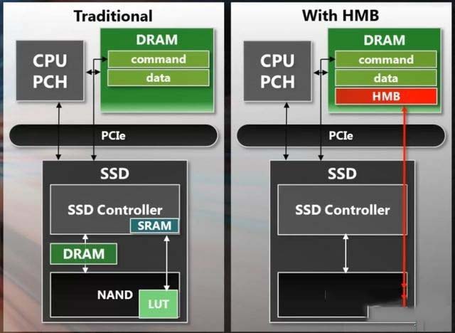 隨著技術(shù)的發(fā)展,DRAM緩存早已不是固態(tài)硬盤的必備組件。透過最新NVMe協(xié)議,固態(tài)硬盤可以調(diào)用主機內(nèi)存的一小部分專用空間存儲FTL映射表,實現(xiàn)精簡增效。