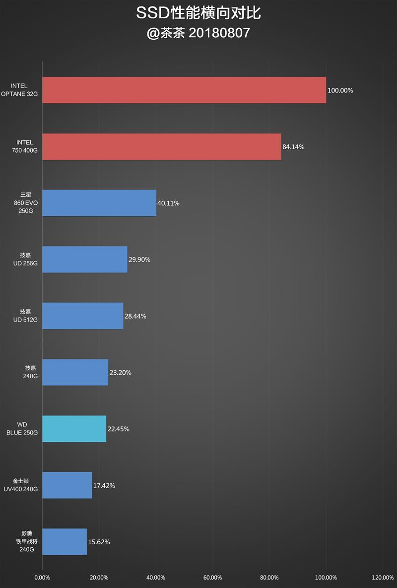 以下為橫向統(tǒng)計的圖表,相對于其他的SATA SSD來說,西數(shù)藍盤的性能不算特別好,與無緩存的技嘉240G相當,大致就是群聯(lián)無緩存方案SSD中偏好一些的水準。